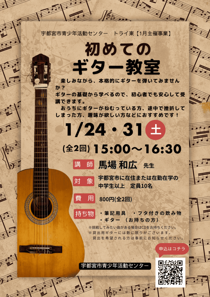 <持ち物>ギター(持っている場合)、筆記用具、フタ付きの飲み物、挑戦してみたい曲がある場合はCDをお持ちください