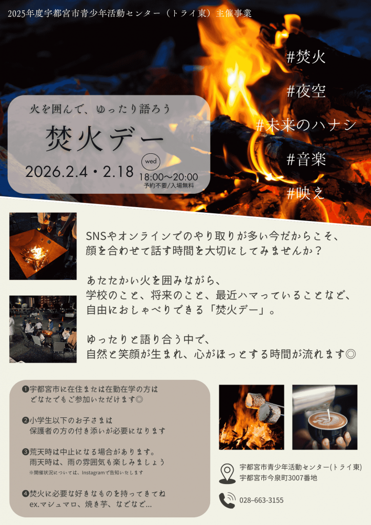 焚火を囲みながらあたたかな時間を過ごしませんか?焙煎を趣味とするスタッフによるコーヒー&ココアの提供・トライカフェでのマシュマロの販売もございます!ぜひお立ち寄りください(^^♪
