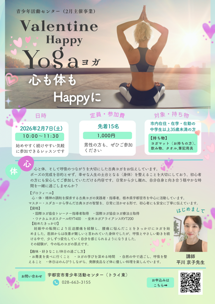 <持ち物>ヨガマット(お持ちの方)、飲み物、タオル、筆記用具