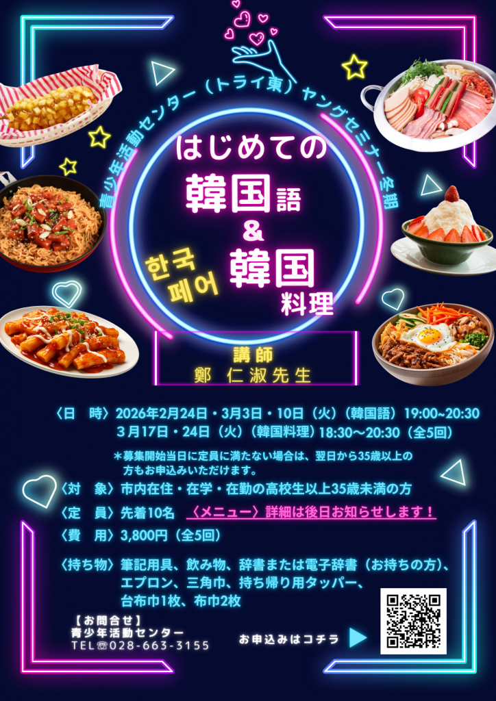 <日時> 【韓国語】2月24日・3月3日・10日(火)19:00~20:30【韓国料理】3月17日・24日(火)18:30~20:30