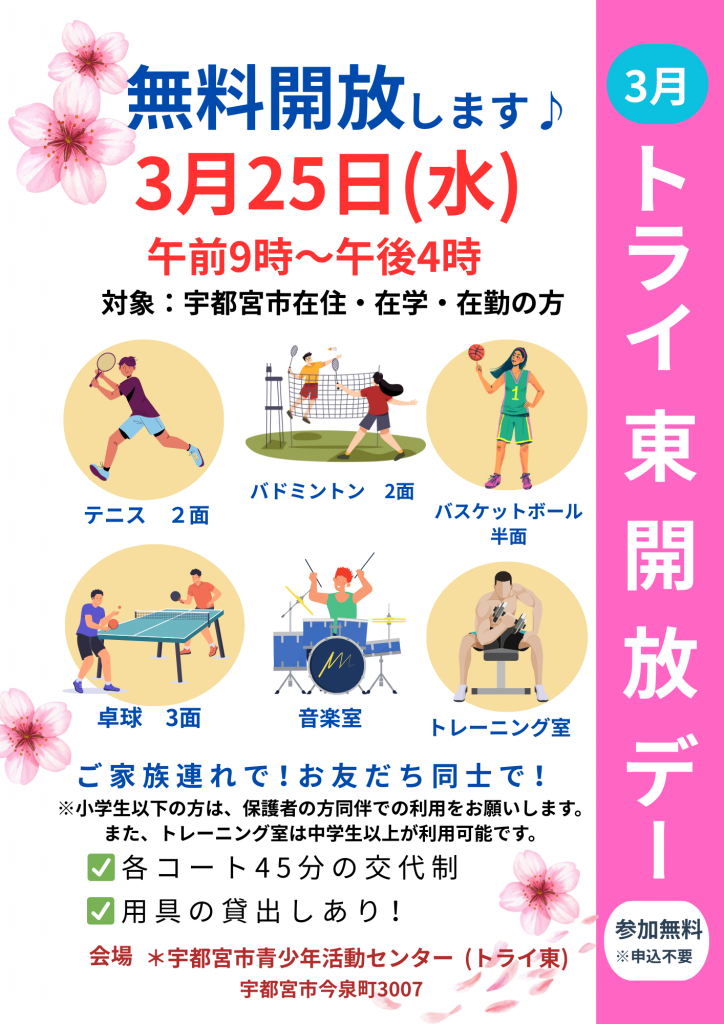 • 卓球(3台) 9:00~16:00 各コート45分無料貸し出し※用具の貸し出しあり